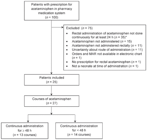 All neonates who were admitted to the NICU from January 1, 2011, to December 31, 2012, and who had received aceta - minophen were screened for inclusion in the study. Neonates (postmenstrual age ≤ 44 weeks) who received all prescribed doses of acetaminophen by continuous rectal administration for at least 24 h in the NICU were included in the study. Patients were excluded if their medication administration records were not available in the electronic chart, if they had not received acetaminophen by rectal administration, or if the route of administration was uncertain. At the study site, usual practice is to avoid excessive use of acetaminophen for patients with pre-existing hepatic or renal dysfunction, although limited doses may be used, with close surveillance, in select cases; hence, pre-existing hepatic or renal dysfunction were not considered as exclusion criteria.