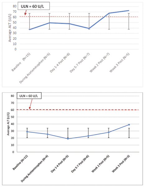 Figure 2 Top: Mean alanine aminotransferase (ALT) levels for all neonates who received rectal administration of acetaminophen, from baseline to 3 weeks after the last acetaminophen dose. A total of 15 acetaminophen courses were included; however, data were not available at all time points for all patients. Bottom: Mean ALT levels for neonates without confounding factors (n = 12 courses). Error bars indicate standard deviations, and the dashed red line in each graph indicates 60 U/L (units per litre), which is the upper limit of normal (ULN). |