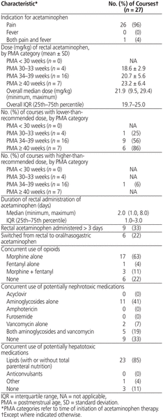 Vingt-cinq patients qui ont reçu un total de 27 traitements par acétaminophène administré par voie rectale répondaient aux critères d’inclusion. L’âge gestationnel médian lors de l’amorce du traitement par acétaminophène était de 37,0 semaines (écart interquartile de 35,0 semaines à 39,8 semaines). Les valeurs d’alanine-aminotransférase demeuraient à l’intérieur des limites normales pendant le traitement par acétaminophène pour tous les patients à l’exception de trois pour lesquels les changements étaient attribués à des facteurs de confusion. La fonction rénale demeurait inchangée. Le critère d’évaluation secondaire quant à l’efficacité (s’appuyant sur le score obtenu dans le PIPP-R) n’a pu être évalué en raison de la prise concomitante d’opioïdes chez la plupart des patients.