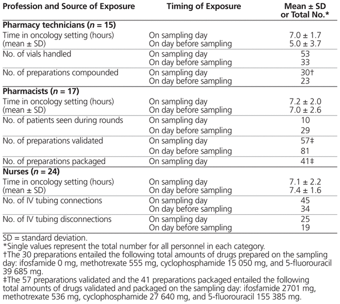 The study was conducted in 2 adult health care centres (750 beds [including 30 oncology beds] and 700 beds [including 28 oncology beds], respectively). Neither of the centres used closed-system drug transfer devices for compounding or administration of drugs. At one centre, all vials were washed upon receipt from the manufacturer; at the other centre, some vials were washed upon receipt. At one centre, IV tubing was primed in the pharmacy; at the other centre, IV tubing was primed by nurses on the various health care units.