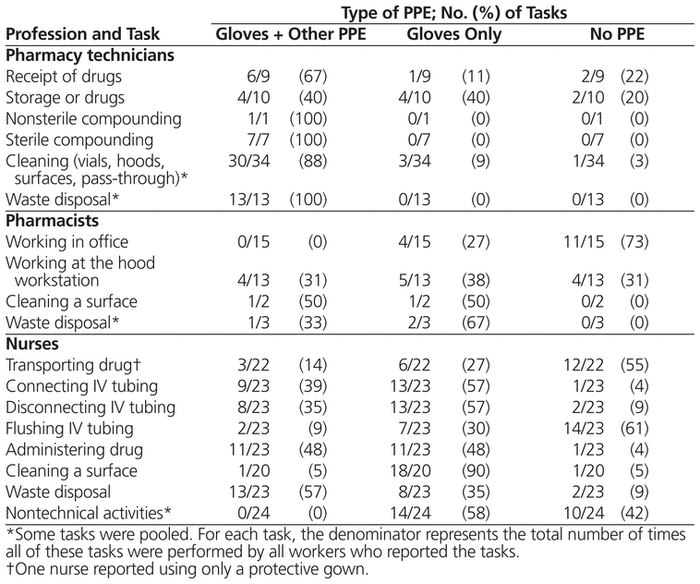 Most workers wore at least gloves for the majority of activities related to handling antineoplastic drugs (Table 2). The pharmacy technicians more often wore other personal protective equipment in addition to gloves. However, for some activities, such as storing vials, working in offices, transporting drugs, flushing the IV tubing, and other nontechnical activities, some workers wore no protection.