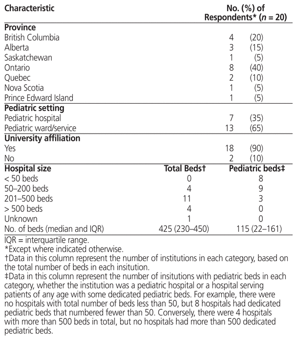 Of 45 sites contacted initially, a total of 42 sites met both criteria, and 47 e-mail contacts were received from potential participants. Forty-seven surveys were then distributed to the 42 sites by email. Twenty-two survey responses were received, but 2 of these did not meet the minimum 50% completion criterion and thus were excluded (survey completion rate 91%). No site reported more than once, so averaging of results was not required. Ultimately, 20 responses were used for data analysis (48% of all sites that met the original criteria). Seven (70%) of the 10 Canadian pediatric hospitals and 13 (41%) of the 32 pediatric/ward services in Canada participated in this survey (Table 1).