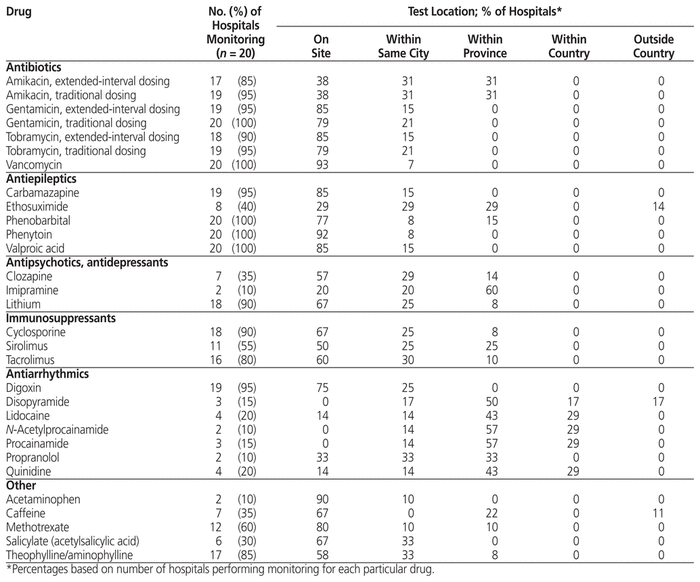 In this study, we found that TDM services are widely available for monitoring drug therapy in pediatric patients in health care centres across Canada, a result that is consistent with TDM surveys conducted in other countries.4–8 All respondents indicated that they provide TDM services for pediatric patients. Our study provides data from 7 provinces across Canada, and captures information for 70% of the 10 Canadian pediatric hospitals. No information was available for Nunavut, Northwest Territories, Yukon, Manitoba, New Brunswick, or Newfoundland and Labrador.