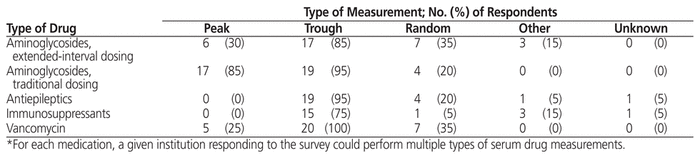 The findings for the types of serum drug measurement ordered were interesting. Thirty percent of sites monitored peak concentrations for aminoglycosides (extended-interval dosing), whereas monitoring only the trough or random concentration is considered the norm.9 We found that only 25% of sites monitored peak vancomycin concentrations, which was not surprising, considering that Delicourt and others10 found previously that Canadian hospitals monitored peak vancomycin concentrations for only about 10% of their patients. Monitoring peak vancomycin concentration is currently controversial in pediatric pharmacotherapy practice, and there are variations in practice across the country and internationally. Finally, a remarkable proportion of responses regarding the types of serum drug measurements ordered were described as “other” (e.g., up to 16% for certain drugs/drug categories). This suggests potential unique variations in practice that this survey may not have been able to fully capture.