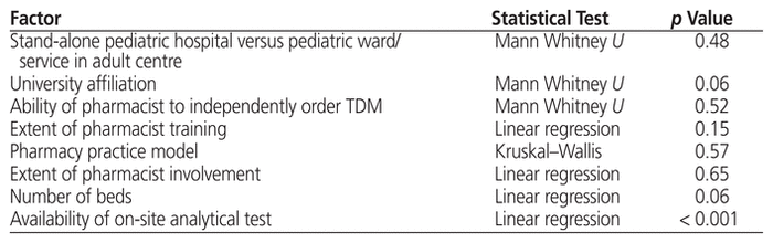 Of the factors determining whether TDM was performed (Table 6), availability of on-site analytical testing was the only one that was statistically significant (R2 = 0.683, p < 0.001).