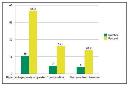 AIM-HIGH data from September 2016 to August 2017 showed an increase in documentation of 9.45 percentage points (from 18.96% to 28.41%) at the departmental level, or a 49.8% improvement in the rate of documentation. All pharmacists had exposure to the interventions, and the 29 pharmacists who were practising at both baseline and the 1-year point were also assessed individually; 16 (55%) of these pharmacists achieved an increase of at least 10 percentage points in documentation rate (Figure 1). Individual assessments were completed to provide auditing and feedback for motivation. These results demonstrated an improvement by both individual pharmacists and the department as a whole and represent the first results of a 3-year, ongoing strategy. Documentation results were shared with all acute care pharmacists on a quarterly basis to ensure engagement in meeting the targeted goals for documentation.