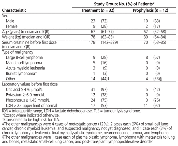 There were 46 orders for rasburicase from June 1, 2010, to November 30, 2016. Of these, 32 (70%) were for treatment of TLS, 12 (26%) were for prophylaxis of TLS, and 2 (4%) were for treatment of hyperuricemia, in the absence of confirmed malignancy. Patient characteristics and baseline TLS markers for prophylaxis and treatment of TLS are presented in Table 1. No patients were documented as having glucose-6-phosphate dehydrogenase deficiency.