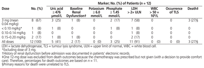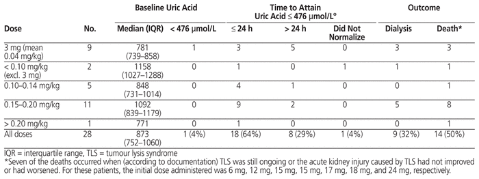 The prescribing practices for rasburicase in this health authority were largely inconsistent, but the most common dose administered was 3 mg (8/12 [67%] among those receiving rasburicase for prophylaxis and 9/32 [28%] among those receiving rasburicase for treatment; combined total 17/44 or 39%). Regardless of dose, rasburicase reduced serum uric acid levels to less than 476 μmol/L and decreased the risk of TLS.