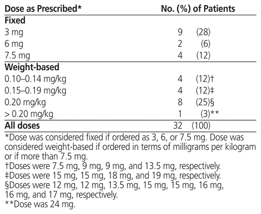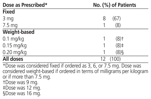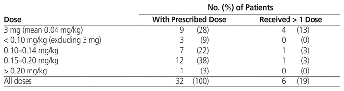 Because of the wide variation in doses administered, the first doses and results are presented relative to the 3-mg dose (the lowest effective dose studied), with other doses being presented in terms of ranges of weight-based doses (i.e., < 0.10 mg/kg, 0.10–0.14 mg/kg, 0.15–0.20 mg/kg, > 0.20 mg/kg) (Tables 2 and 3). Tables 4 and 5 show the administered first doses as prescribed (i.e., fixed dosing: 3, 6, or 7.5 mg and weight-based dosing).