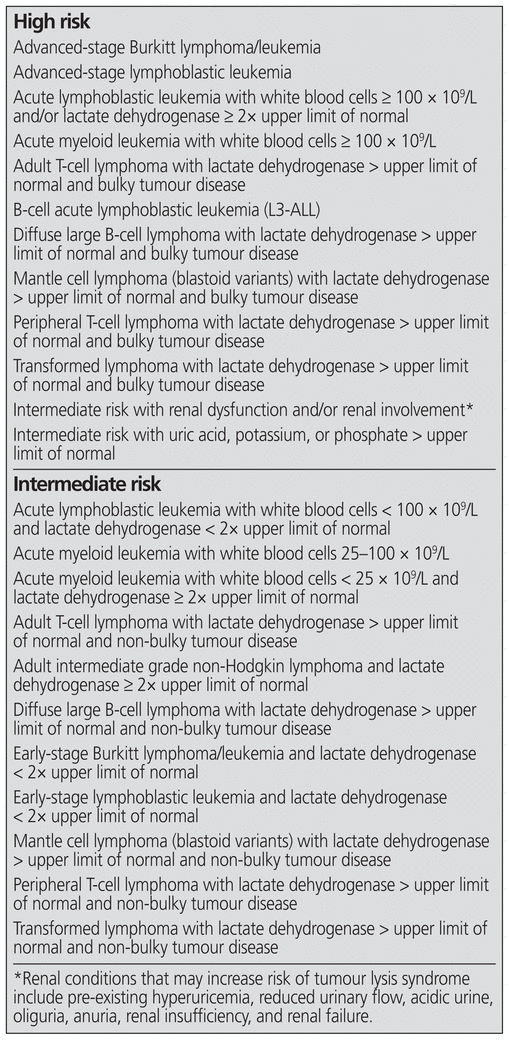 The likelihood of TLS depends on age, stage of malignancy, tumour burden, tumour grade and turnover rate, white blood cell (WBC) count, lactate dehydrogenase (LDH) level, pre-existing renal impairment, renal involvement by the tumour, intensity of cancer treatment, sensitivity of the tumour to cytotoxic therapy, patient’s sex, baseline uric acid levels, and use of drugs that increase uric acid.1–4 Malignancies with rapid cell proliferation or large tumour burden are considered to carry high risk for TLS, as it is theorized that high nucleoprotein turnover increases serum uric acid.5Box 1 lists conditions that are considered to be associated with high and intermediate risk for TLS.3,6 Although TLS is more commonly observed with rapidly dividing hematologic malignancies and after cytotoxic chemotherapy,1,4 it has been reported with nearly all malignancies, either spontaneously or after radiation therapy, cytolytic antibiotic therapy, intrathecal chemotherapy, dexamethasone, and newer chemotherapeutic agents.2,4,7–12