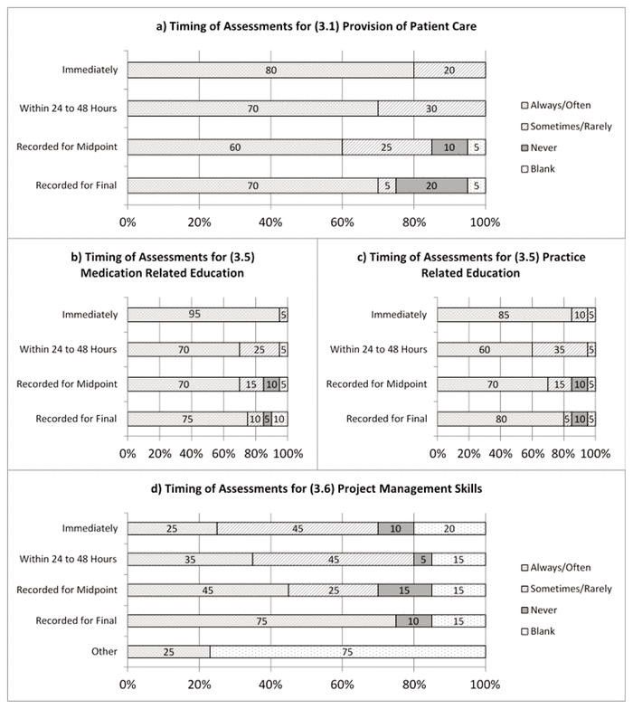 To have the desired effect, assessments should be performed frequently,3,18 although the benefit associated with timing of feedback may vary depending on the focus of the assessment.19 Assessments done immediately may aid in faster acquisition of knowledge and skill related to specific tasks, whereas a delay in feedback may allow increased automaticity in development of learning strategies and process.19 Most respondents reported an expectation that assessments would be conducted immediately or within 24 to 48 h for the provision of patient care and for the provision of medication- and practice-related education. Fewer programs assessed these competencies at the midpoint and end of the residency, which may reflect a focus on reinforcing knowledge and skill at the time of acquisition. However, the CPRB accreditation standards continue to recommend midpoint assessments, and they require final assessments.4 Variation in the timing of assessment of residents’ project management skills was noted, which may reflect the time required for review of written documents. Two respondents commented that the timing of assessment for this competency varied according to completion of activities or the schedule of activities that had been laid out.
