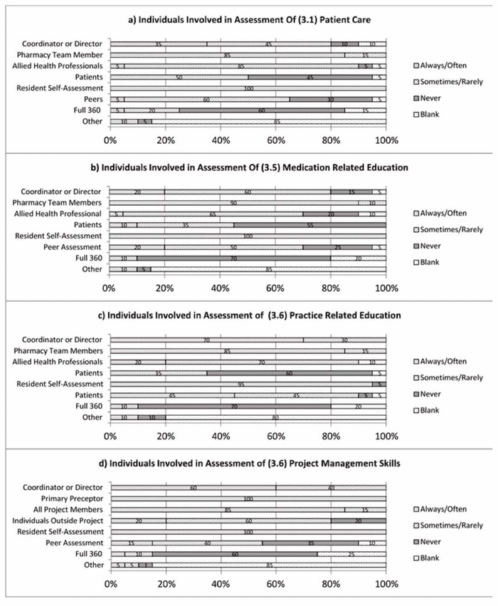 Involvement of multiple individuals, specifically patients and allied health professionals, has been suggested as essential for successful assessment within competency-based medical education, 9,18 and pharmacy residency programs may benefit from adopting this practice. Assessment for the various competencies largely relied on pharmacy team members, which may reflect the 2010 standards requiring qualified pharmacists or pharmacy technicians to act as preceptors.1 Only one program reported regular use of allied health professionals in the assessment of patient care. Few programs used allied health professionals (5% “often” or “always”) or patients (10% “often” or “always”) in the assessment of medication-related education (representing 1% and 2.5% of the total residency spots, respectively). The more recent CPRB standards, released in 2018, identify the need to include patients and health care providers and require their input in the assessment of residents.4 Patient feedback surveys with a Likert-scale rating, along with review of findings with a preceptor could help to ensure that feedback is specific and meaningful.20 Additionally, self-assessment remains an essential component of competency-based training, and all of the surveyed programs included self-assessment “often” or “always” for each competency. It has been suggested that self-assessment in isolation is ineffective and potentially dangerous,18 so it is important to note that the respondent programs did not rely on resident self-assessment in isolation—all of the programs made use of at least one other individual in assessment of each competency.