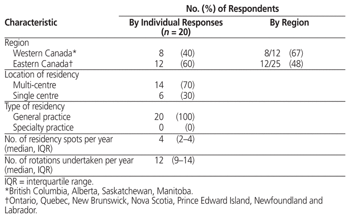 A total of 22 responses were received. Following screening for and elimination of duplicates, information from 20 (54%) of the 37 Canadian year 1 programs was included in the analysis. Respondents represented programs in 7 of the 9 provinces with residency programs both large (more than 10 residents accepted annually) and small (10 or fewer residents accepted annually). During the 2017/2018 residency year, 196 residency positions were offered nationally,14 including the 85 potential positions reported by Quebec Clinical Master’s programs. The responses received accounted for 139 (71%) of available positions. All respondents were from general practice residency programs (100%) in predominantly multicentre organizations (70%) (Table 1).