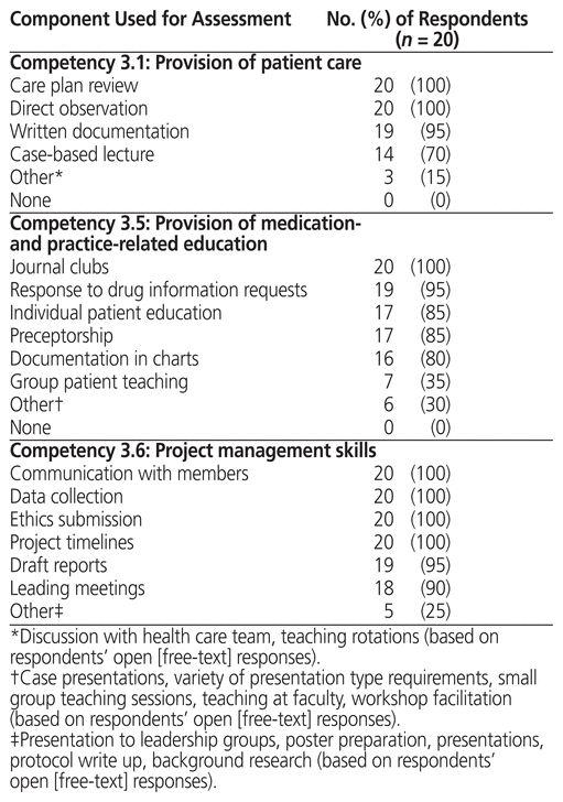 The curricular components used to assess direct patient care included care plan review (100% of respondents), direct observation of patient care activities (100%), and written documentation of patient care (95%) (Table 2). Respondents also reported discussions with the health care team and the use of a teaching rotation as “other” components of assessment. The components used to assess provision of medication- and practice-related education were journal clubs (100%), response to drug information requests (95%), individual patient education (85%), and preceptorship (85%). Group teaching sessions were used by fewer programs (35%). Assessment of competency in project management was consistently based on creating project timelines, communication with project members, ethics submission, and data collection (100% for all). Additional components cited by 5 (25%) of the programs included presentations to leadership groups, poster preparation, protocol write-up, and background research.