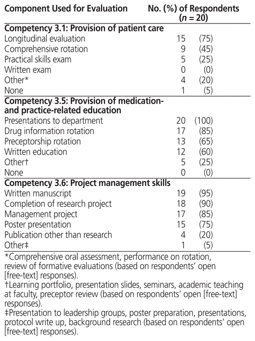 The curricular components used for evaluation of direct patient care were longitudinal evaluations (75% of respondents), comprehensive final rotations (45%), and practical skills examinations (25%) (Table 3). Four programs (20%) cited other evaluation components, including a comprehensive oral evaluation, which was used by one of the programs. Provision of medication- and practice-related education was evaluated via departmental or staff presentations in all programs, and additionally through specific rotations: 17 programs (85%) had a drug information rotation and 13 (65%) had a preceptorship rotation. Fewer programs used written education (60%) or other components (25%), such as learning portfolios, presentation slides, and seminars or academic teaching, as curricular components for evaluation. All respondents indicated that a research project was used for demonstration of project management skills; however, 12 programs (60%) additionally used non–research-based projects, such as mini-projects (e.g., audits). Evaluation of competency was predominantly based on written manuscripts (95%), completion of a research project (90%), a separate management project (85%), or a poster presentation of results (75%). Few programs (20%) used an additional publication for evaluation of project management.