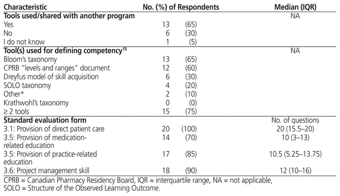 Thirteen programs (65%) reported sharing assessment and evaluation tools with another program (Table 4). The majority of programs (75%) used more than 1 tool to define competency, the most common tools being Bloom’s taxonomy16 (65%) and the CPRB “levels and ranges”11 document (60%). Most programs used standard evaluation forms for assessment of the 3 competencies; however, the median number of questions on each evaluation form ranged from 10 (IQR 3–13) to 20 (IQR 15.5–20), depending on the competency.