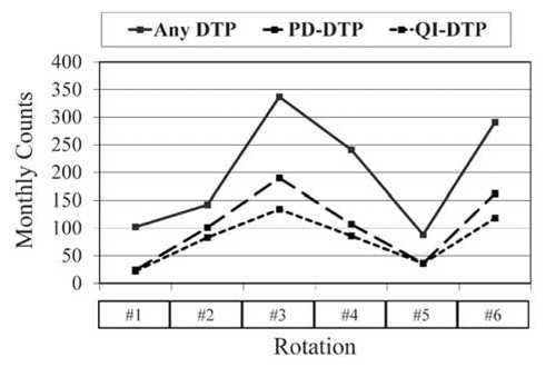 During the study period, all 4 residents consented and participated in the study. DTP data were captured by 1 resident who completed 3 clinical rotations and 3 residents who completed 6 clinical rotations, for a total of twenty-one 4-week rotations with data capture. Pharmacy practice residents resolved a total of 1201 DTPs during the study period. Of these, 620 (52%) were PD-DTPs and 479 (40%) were QI-DTPs. As depicted in Figure 1, the monthly group counts for all DTPs, PD-DTPs, and QI-DTPs increased over time for the first 3 rotations, decreased for rotations 4 and 5, and increased for rotation 6.