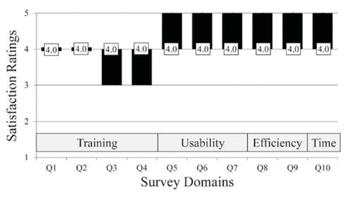 A nonvalidated 10-question Likert-type questionnaire was developed by the investigators to elicit residents’ satisfaction with domains of training, usability, efficiency, and time requirements (Appendix 1). Potential responses ranged from 1 (strongly disagree) to 5 (strongly agree). The survey questionnaire was deployed with SurveyMonkey (San Mateo, California; www.surveymonkey.com).