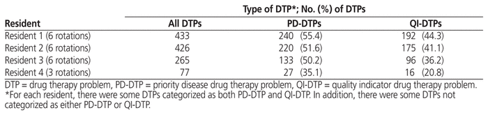 Canadian pharmacy practice residency programs promote development of key competencies for direct patient care resulting in resolution of drug therapy problems (DTPs), which is 1 of 8 national clinical pharmacy key performance indicators. There are no Canadian data on the contribution of residents to resolution of DTPs, including DTPs for priority diseases covered in disease-state education modules (PD-DTPs) or quality indicator DTPs (QI-DPTs), as assessed through application of evidence-based interventions proven to reduce morbidity, mortality, or health resource utilization.