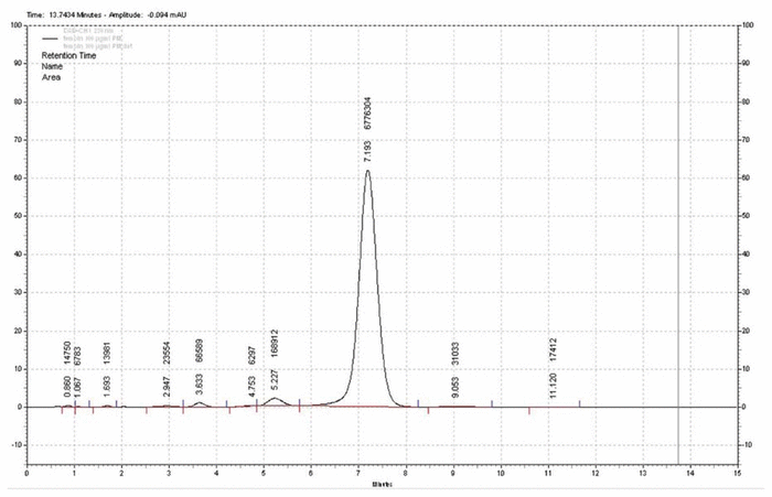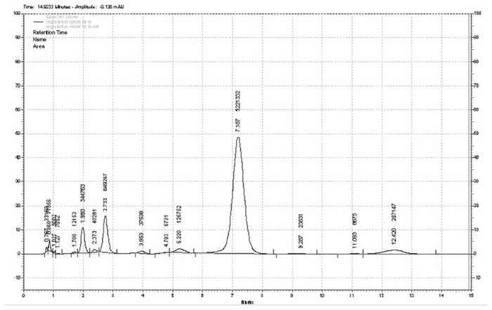 The stability-indicating capability of the assay was tested under various conditions of forced degradation. More specifically, the UV spectral purity of the vancomycin peak in chromatograms of the degraded samples was compared with the spectrum of the undegraded sample of vancomycin obtained at time 0. A sample chromatogram of vancomycin without forced degradation is presented in Figure 1, with retention time of 7.19 min, and a chromatogram of vancomycin after alkaline degradation in Figure 2. The mass balance and retention of degradation products relative to the pure vancomycin peak are presented in Table 1. After forced degradation, the extent of degradation was 25% under acidic conditions, 23% under alkaline conditions, and 14% with heating. No degradation occurred under oxidative conditions.