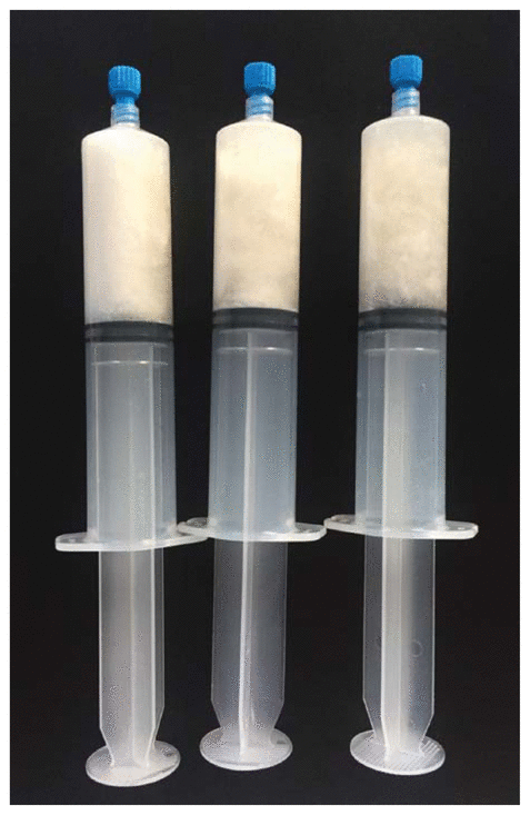 Figure 4 Appearance of vancomycin 83.3 mg/mL in 0.9% sodium chloride, after storage in syringes for 5 days. |
