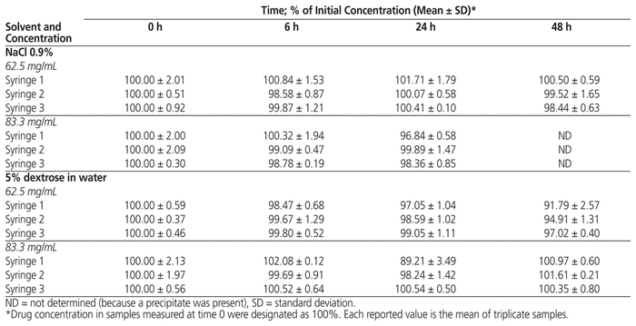 At a concentration of 62.5 mg/mL and after storage for 48 h, syringe 1 retained 91.79% of the initial concentration with a standard deviation (SD) of 2.57%. This SD value is related to the low value obtained for 1 of the 3 samples prepared for this syringe. At a concentration at 83.3 mg/mL and after storage for 24 h, syringe 1 retained slightly less than 90% of the initial concentration, but after storage for 48 h, the value was more than 90%. We assume that these results are related to a technical problem, probably due to the 2 dilutions required to obtain the target (theoretical) concentrations.