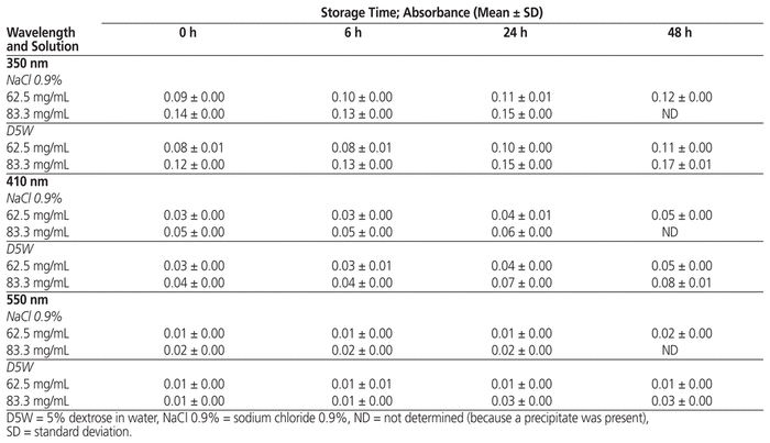 In terms of subvisual inspection, mean absorbance values for the 3 wavelengths (350, 410, and 550 nm) after the various storage periods are presented in Table 3.