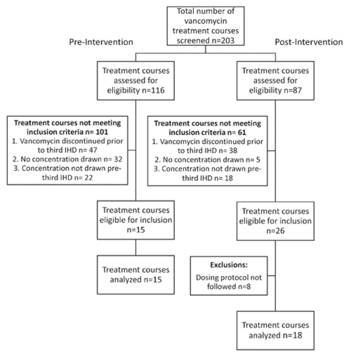 Eligible treatment courses were identified through electronic patient care and pharmacy systems. Lists of patients receiving both IHD and vancomycin were generated from the pharmacy system, and administration of specific vancomycin doses was confirmed through medication administration records.