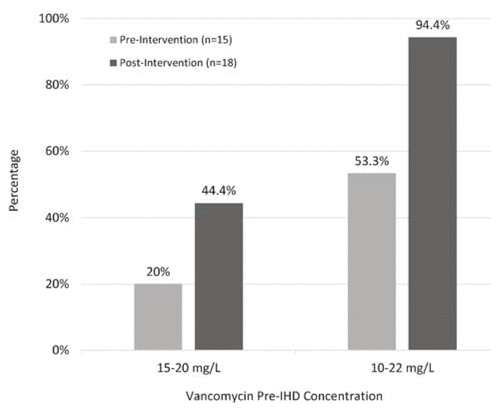 At the study institution, the likelihood of achieving recommended vancomycin concentration increased (relative to previous practice) after implementation of a simplified vancomycin dosing protocol for patients undergoing IHD.