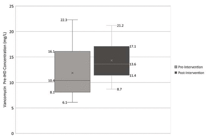 The study included inpatients and outpatients receiving IHD at KHSC and selected satellite hemodialysis units, who received at least 2 IV doses of vancomycin and for whom vancomycin concentration was measured in an appropriately drawn sample before the third IHD session. Concentration values as measured in samples drawn up to 12 h before the third IHD session were included. Pre-intervention treatment courses were identified from a historical cohort of patients who underwent IHD from October 1, 2016, to April 30, 2017, and post-intervention treatment courses were identified prospectively from October 1, 2017, to April 30, 2018. Treatment courses were excluded if continuous renal replacement therapy or peritoneal dialysis was used after initiation of vancomycin therapy, before the sample was drawn for measurement of pre–third IHD vancomycin concentration. In the post-intervention period, treatment courses that did not follow the dosing protocol were excluded. Most of the patients in both groups received IHD 3 or 4 times weekly. All patients underwent dialysis with high-flux membranes (FX HDF 800 [Fresenius Medical Care, Homburg, Germany] or Exeltra 170 [Baxter Healthcare Corporation, Deerfield, Illinois]).