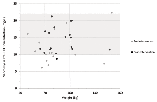 An upper threshold for optimal pre-IHD vancomycin targets has not been well defined in existing guidelines, nor has a threshold been explicitly reported in the literature. In the general population, vancomycin use has been linked to nephrotoxicity, especially at high trough concentrations.3 On the basis of extrapolation from existing studies, high pre-IHD vancomycin concentrations are avoided at KHSC in an effort to preserve any residual renal function, which is associated with greater patient survival.15