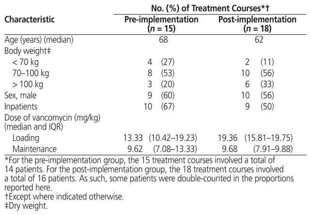 During protocol implementation, the proposed loading and maintenance doses were pre-populated in the patient care system of the outpatient hemodialysis unit, with corresponding weight ranges shown in brackets, to facilitate selection of the appropriate doses during prescribing by computerized physician order entry. The institutional vancomycin dosing and monitoring guidelines were updated with the study dosing protocol. This served to facilitate prescribing of IV vancomycin within the paper-based system for inpatients receiving IHD. Pharmacists reviewed inpatient vancomycin orders and intervened as needed to ensure that the dosing protocol was followed, as clinically appropriate. Education was also provided to the physicians and other staff implicated in this study through in-person presentations and e-mail communications. Reference cards detailing the weight threshold–based dosing protocol were also circulated to hemodialysis units.