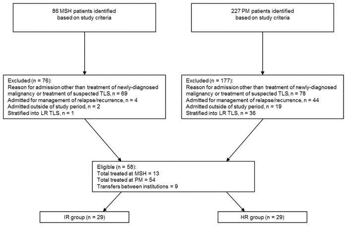 Figure 1 Patient flow diagram. Two patients met the study inclusion criteria both at the time of their admission to Princess Margaret Cancer Centre (PM) and at the time of their transfer from PM to the intensive care unit of Mount Sinai Hospital (MSH). LR = low risk, IR = intermediate risk, HR = high risk, TLS = tumour lysis syndrome. |