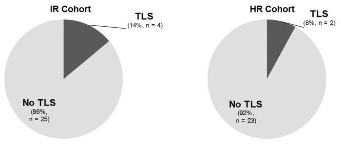 Figure 2 Occurrence of tumour lysis syndrome (TLS) among patients who did not present with TLS. IR = intermediate risk, HR = high risk. |