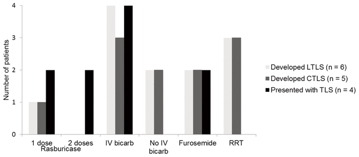Of the 6 patients in whom TLS developed during admisson, 4 had serum uric acid at or above 476 μmol/L, yet only 1 received rasburicase. Four of these 6 patients received IV fluids containing sodium bicarbonate, whereas the remaining 2 received IV fluids without sodium bicarbonate. RRT was initiated for 3 of these 6 patients.