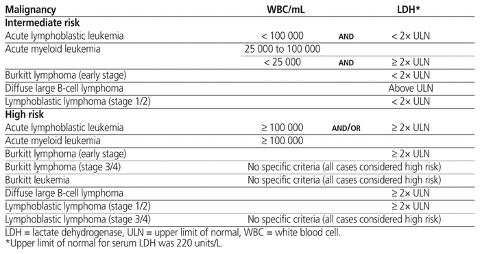 Tumour lysis syndrome (TLS) is a medical emergency in which massive lysis of malignant cells upon exposure to cytotoxic therapy leads to metabolic derangements and organ dysfunction, including renal failure, seizures, and cardiac arrhythmias. 1 Acute lymphoblastic leukemia, acute myeloid leukemia, and aggressive non-Hodgkin lymphoma pose the greatest risk of TLS; however, other cancers with specific tumour-related factors (such as high sensitivity to cytotoxic therapy, high tumour burden, or high rate of proliferation) are also susceptible.1,2 TLS may also occur spontaneously in the absence of cytotoxic therapy, but is more commonly induced by initial exposure to a cytotoxic agent such as hydroxyurea, steroid, or definitive chemotherapy.3