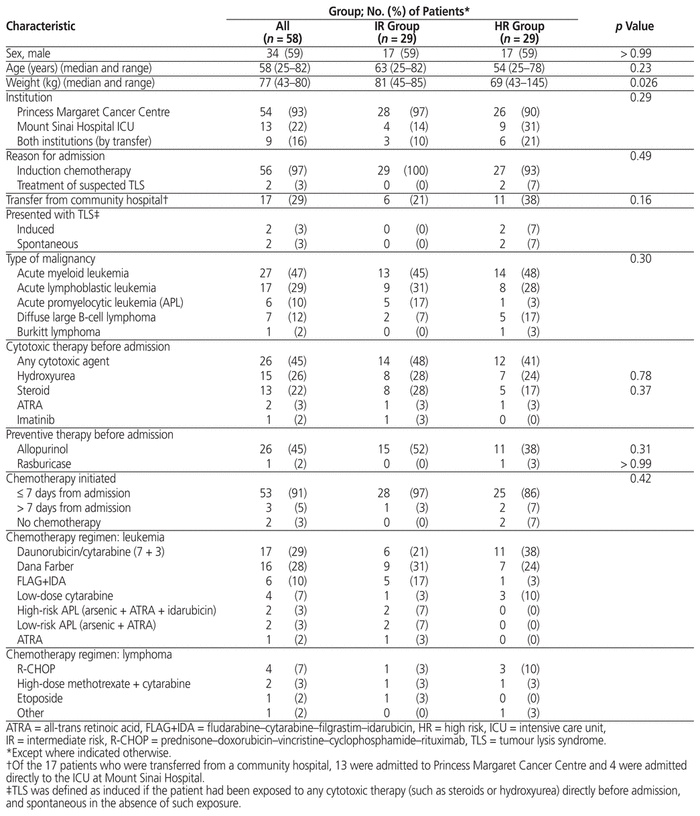 In this study, TLS developed during admission for 14% of intermediate-risk and 8% of high-risk patients. It has been estimated that intermediate-risk patients have a 1%–5% chance of tumour lysis, whereas high-risk patients have a greater than 5% risk of tumour lysis.3 We observed that high-risk patients were more likely than intermediate-risk patients to have a relevant laboratory abnormality, which might have prompted more aggressive management (for example, administration of a higher volume of IV fluids) to decrease the likelihood of TLS.