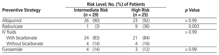Fifty-eight patients (29 at intermediate risk, 29 at high risk) were eligible for inclusion. Use of preventive allopurinol, IV bicarbonate, and furosemide was similar between groups. Rasburicase was more frequently used for high-risk patients (3% [1/29] of intermediate-risk patients versus 36% [9/25] of high-risk patients; p = 0.003). In 4 (14%) of the intermediate-risk patients and 2 (8%) of the high-risk patients, TLS developed during the admission. TLS was observed in 10% (1/10) of patients who received preventive rasburicase and 11% (5/44) of those who did not (p > 0.99), and in 9% (4/45) of patients who received preventive IV bicarbonate and 25% (2/8) of those who did not (p = 0.22). Treatment strategies included rasburicase, IV bicarbonate, furosemide, and renal replacement therapy.