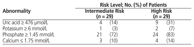 Abnormal laboratory findings were more common in high-risk than in intermediate-risk patients. Several patients had an abnormal result for only 1 laboratory parameter and thus did not satisfy the criteria for laboratory TLS (Table 6).
