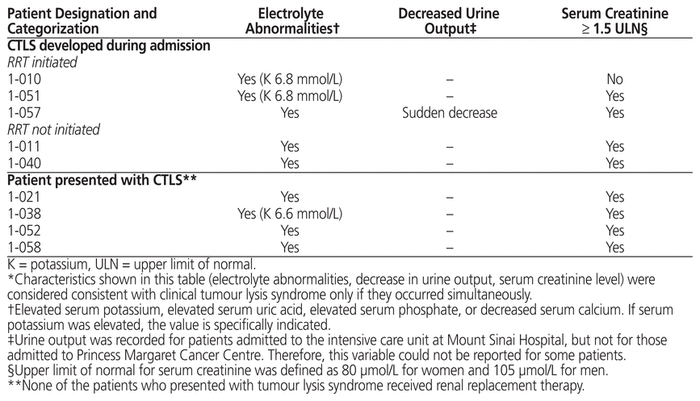 Strategies employed for the treatment of TLS were similar between those who presented with TLS and those in whom TLS developed during the admission, although a comparative analysis of treatment interventions was not performed because of the small sample size. Only 1 of the 2 patients who presented with TLS and who received 2 doses of rasburicase had persistence of serum uric acid above 476 μmol/L before administration of the second dose. Interestingly, 3 of the 6 patients in whom laboratory TLS developed during admission had serum uric acid above 476 μmol/L yet did not receive rasburicase; 2 of these patients also experienced clinical TLS (in the form of acute kidney injury). The decision to not administer rasburicase in these instances was likely multifactorial and influenced by the acuity of the patient’s presentation, in combination with the decision to pursue other management strategies when possible (e.g., RRT in the ICU).