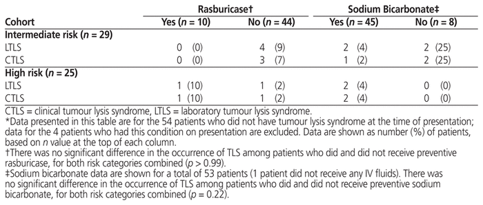Cinquante-huit patients (29 présentant un risque moyen et 29 un risque élevé) étaient admissibles. L’utilisation d’allopurinol à titre préventif, de bicarbonate par voie intraveineuse et de furosémide était similaire d’un groupe à l’autre. Le rasburicase était plus fréquemment utilisé pour les patients présentant un risque élevé (3 % [1/29] de patients présentant un risque moyen contre 36 % [9/25] de patients présentant un risque élevé; p = 0.003). Quatre (14 %) patients présentant un risque moyen et deux (8 %) présentant un risque élevé ont développé un SLT pendant l’admission. Le SLT a été observé chez 10 % (1/10) des patients ayant reçu du rasburicase à titre préventif et chez 11 % (5/44) des patients qui n’en avaient pas reçu (p > 0,99); il a aussi été observé chez 9 % (4/45) des patients ayant reçu du bicarbonate par voie intraveineuse à titre préventif et chez 25 % (2/8) des patients qui n’en avaient pas reçu (p = 0.22). Les stratégies de traitement comprenaient le rasburicase, le bicarbonate par voie intraveineuse, le furosémide et la thérapie de remplacement rénal.