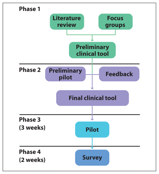 Development of the final tool involved 4 separate phases (Figure 1). Phase 1 was intended to inform the tool content and context through literature searches and focus groups of clinical pharmacists. Phase 2 focused on formulation of the clinical tool itself. Phase 3 involved piloting the candidate clinical tool, and Phase 4 involved deployment of a survey to participating pharmacists to gauge their perceptions of it (especially pertaining to usability and feasibility). The study protocol was approved by the local Behavioural Research Ethics Board, and informed consent was obtained from all pharmacist participants before their involvement in the study.