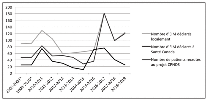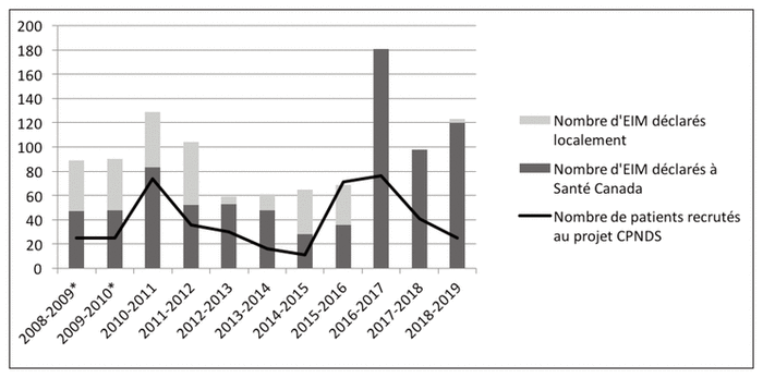 Figure 1 Profil du nombre de déclarations locales d’effets indésirables médicamenteux (EIM), du nombre de déclarations d’EIM à Santé Canada et du nombre de patients recrutés dans le programme CPNDS (Réseau canadien de surveillance en pharmacogénomique) du 1er avril 2008 au 31 mars 2019. |