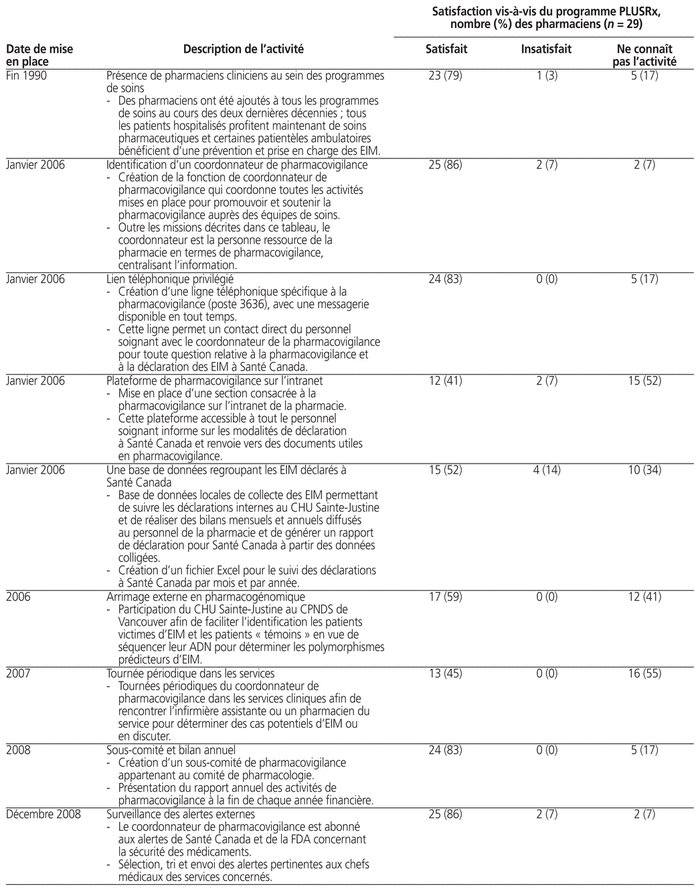 Tableau 1 Profil chronologique croissant des activités du programme de pharmacovigilance PLUSRx ainsi que le degré de satisfaction des pharmaciens vis-à-vis de chacune des activités