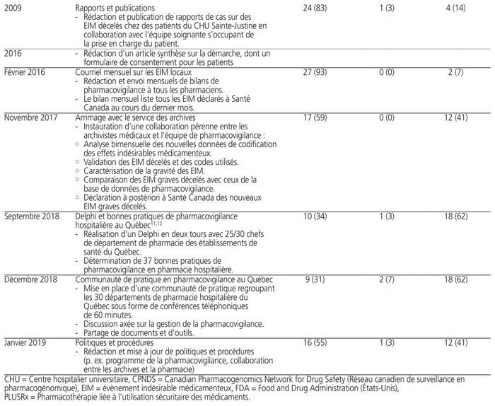 Dans la littérature canadienne, il n’existe pas d’exemples similaires qui présentent un programme global incluant une variété d’activités de soins et de soutien. Toutefois, plusieurs études confirment la capacité des pharmaciens à prévenir, déceler et prendre en charge ou à déclarer les EIM et, au cours des dernières années, la littérature démontre un intérêt croissant entourant l’évaluation de tels programmes. Par exemple, He et collab.13 ont démontré l’intérêt de décentraliser les pharmaciens dans les équipes de soins tertiaires et de les faire participer aux tournées de patients afin d’accroître la détection et la déclaration des EIM. Van Grootheest et de Jong-van den Berg14 ont commenté la contribution essentielle des pharmaciens hospitaliers et communautaires à la prévention, à la prise en charge et à la déclaration des EIM aux Pays-Bas. Phansalkar et collab.15 ont mené une méta-analyse portant sur 13 études. Elle confirme la supériorité des pharmaciens par rapport à d’autres professionnels (c.-à-d. médecins, infirmières et archivistes médicaux) pour la détection rétrospective d’EIM à partir de dossiers patients15. Yu et collab.16 se sont intéressés aux EIM sévères détectés dans un hôpital pédiatrique de janvier 2011 à septembre 2014. Les auteurs ont mis en évidence un programme de pharmacovigilance placé sous la responsabilité des pharmaciens, ayant permis la détection de 166 EIM graves survenus chez 163 patients. Morales Ríos et collab.17 ont décrit un programme hospitalier de pharmacovigilance dans un établissement pédiatrique du Mexique, ayant eu un impact positif sur la détection et la déclaration des EIM. Leur programme a permis la transition de la déclaration des EIM d’un système papier à un système informatisé plus efficient17. Notre étude illustre la faisabilité d’implanter et de maintenir un programme de pharmacovigilance qui soutienne la prestation de soins pharmaceutiques offerts par les pharmaciens cliniciens dans les programmes de soins. Le Programme est original, notamment avec l’arrimage de la pharmacie au service des archives et les nouvelles stratégies de codification des EIM, la détermination des bonnes pratiques et la mise en place d’une communauté de pratique au Québec.