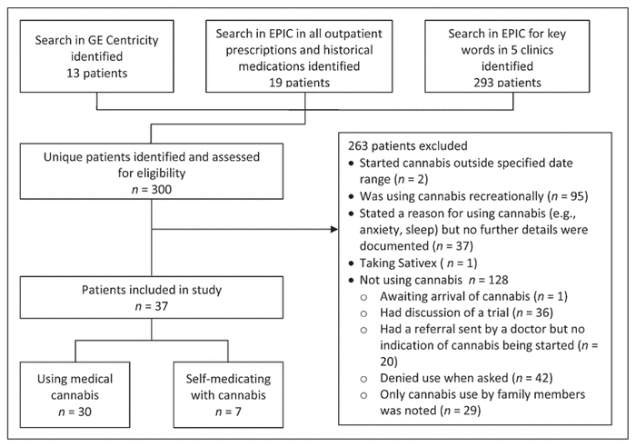 Initial data capture identified a total of 300 unique patients whose medical charts were reviewed for eligibility. After review, 37 patients were included and 263 were excluded for the reasons specified in Figure 1. For most of those excluded (n = 128), review of the medical record showed that they were not using cannabis.