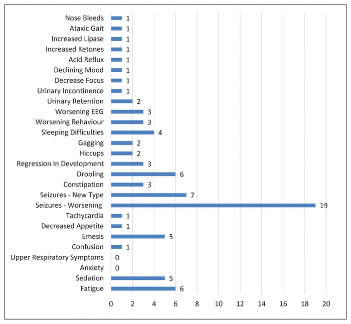 The most frequent negative side effect noted in the current study was worsening of seizures. Notably, 5 patients discontinued cannabis because of an increase in seizure frequency. This observation is consistent with previous reports of worsening of seizures associated with use of cannabis.6,8 The percentage of patients experiencing an increase in seizure frequency following medically supervised cannabis use was higher in the current study than that observed by Tzadok and others,6 who reported seizure aggravation for 7% of patients. The rate may have been higher in the current study because many patients experienced concurrent changes to their antiepileptic medications.