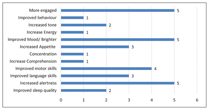 Figure 3 Positive side effects documented for patients with medically supervised cannabis usage (n = 30). The numbers of patients sum to more than 30 because some patients had more than one documented positive side effect. |