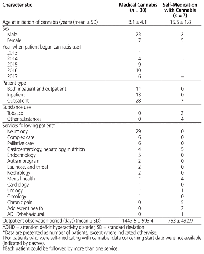 For purposes of a study such as ours, confirmation of medical authorization for cannabis can be achieved either by verifying the source of cannabis to be a licensed producer or by verifying the medical authorization document. Given the retrospective nature of the study and the lack of standardization of documentation in patient charts, it was not possible to confirm medical authorization in each case. Therefore, we included all inpatients and outpatients 18 years of age or younger who were followed at CHEO between May 1, 2014, and May 1, 2017, and whose charts contained documentation of use of cannabis for therapeutic purposes, regardless of authorization.