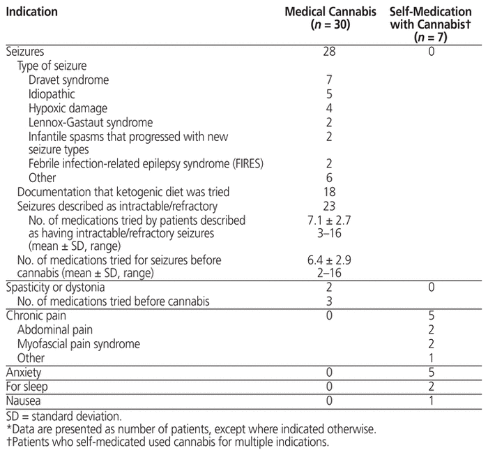 In total, 300 patients were identified, of whom 37 met the inclusion criteria. Of these, 30 patients had documentation of medically supervised cannabis use. Most were using cannabis for seizures (n = 28), and many of these (n = 23) were patients with seizures described as intractable or refractory. Of the 27 patients who were experiencing seizures at initiation of medical cannabis, 21 had documentation of a decrease in seizure frequency. This decrease was transient for 16 patients, with a mean duration of 130.4 days (standard deviation 99.1 days). Seven patients self-medicated with cannabis. They obtained cannabis without authorization and used it for chronic pain (n = 5) and/or anxiety (n = 5).